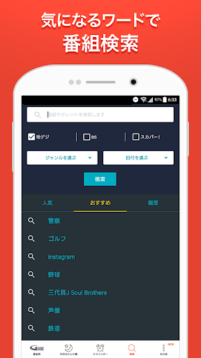 注目の番組や人気のタレントが出演している番組検索も可能。対応のBDレコーダーとの連携によるリモート録画予約もできます。